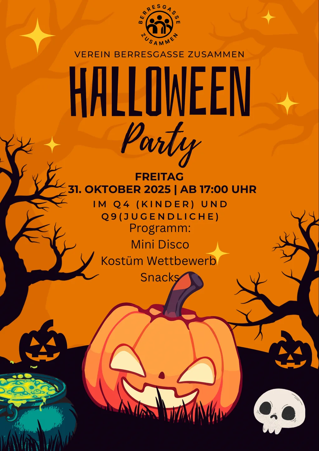 Liebe Nachbarn, am Freitag, 31. Oktober 2025 ab 17:00 Uhr veranstalten wir gemeinsam unsere große Halloween Party! 🕸️ Die Feier findet im Q4 (Kinder) und Q9 (Jugendliche) statt – mit Mini Disco, Kostümwettbewerb und leckeren Snacks. 🍬🧡
